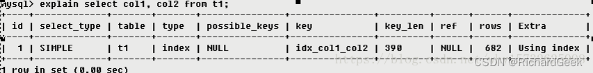 覆盖索引(select 后要查询的字段刚好和创建的索引字段完全相同),则该索引仅出现在key列表中