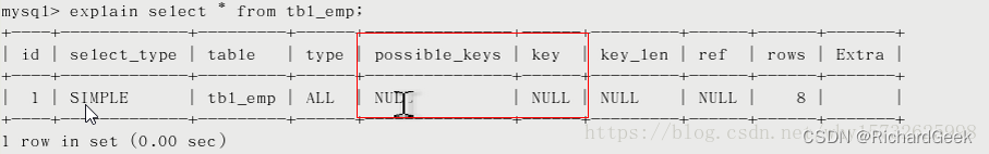possible_keys 显示可能应用在这张表中的索引,一个或多个。查询涉及到的字段上若存在索引,则该索引将被列出,但不一定被查询实际使用。