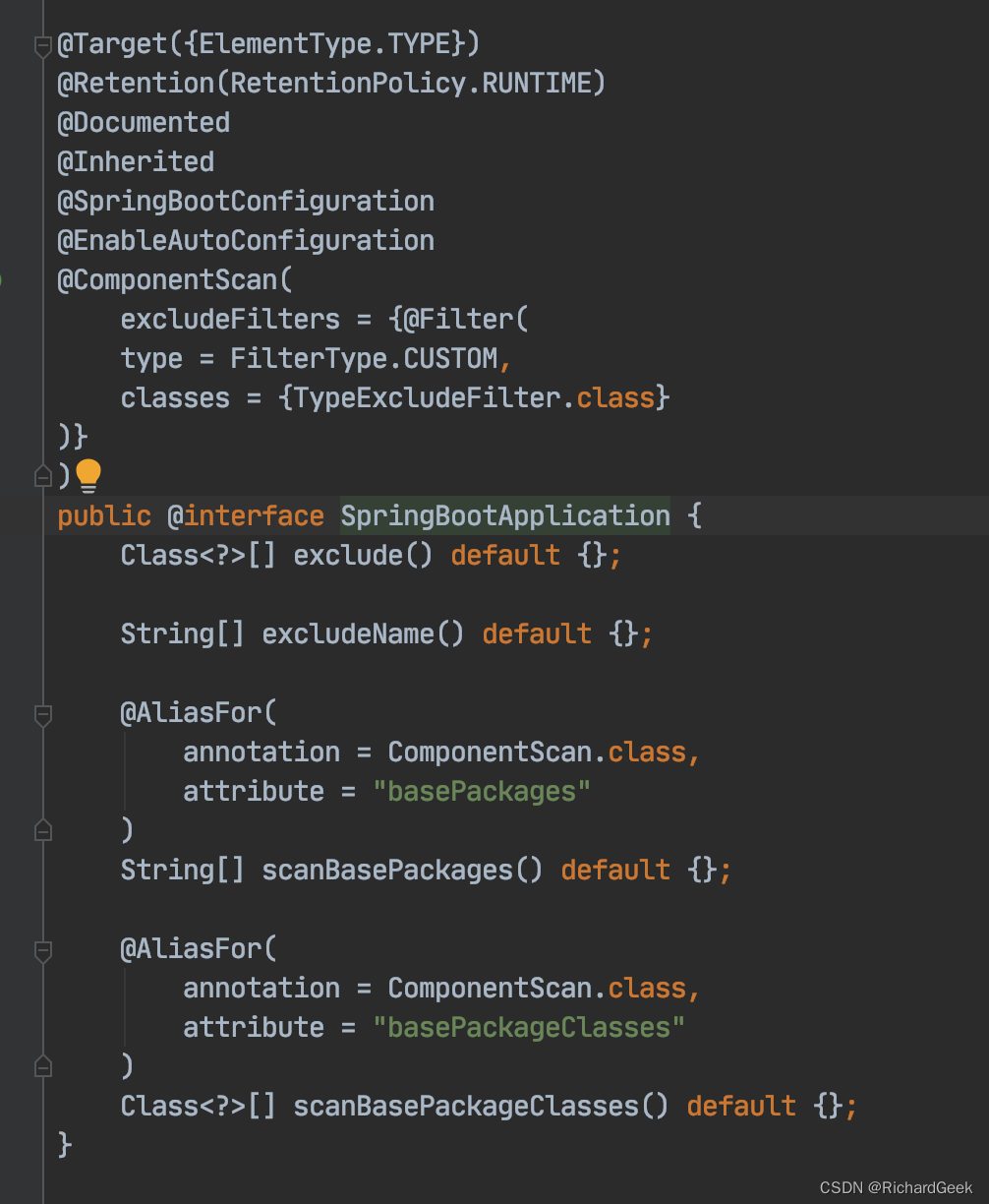 在 SpringBoot 入口类上,唯一的注解就是 @SpringBootApplication。它是 SpringBoot 项目的核心注解,用于开启自动配置,更准确地说,是组合注解。如包含了@EnableAutoConfiguration开启自动装配功能。