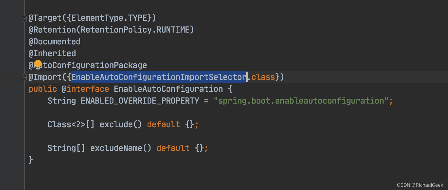 @Import的许多功能都需要借助接口ImportSelector来实现,ImportSelector决定可引人哪些 @Configuration的注解类,ImportSelector接口源码如下: