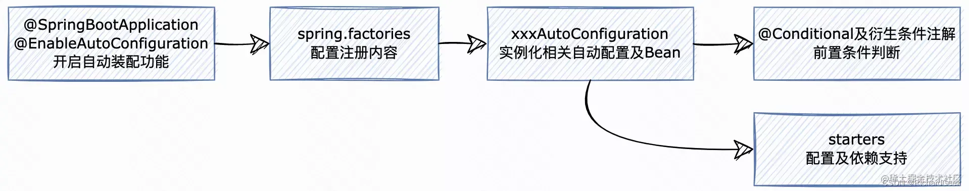 SpringBoot 最核心的功能就是自动装配,Starter 作为 SpringBoot 的核心功能之一,基于自动配置代码提供了自动配置模块及依赖的能力,让软件集成变得简单、易用。使用 SpringBoot 时,我们只需引人对应的 Starter,SpringBoot 启动时便会自动加载相关依赖,集成相关功能,这便是 SpringBoot 的自动装配功能。