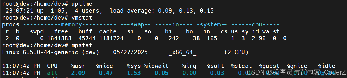 以上打印的信息依次为:系统当前时间、已运行时间、 登陆用户数、系统平均负载。其中平均负载这里的三个数字分别表示过去1分钟、5分钟、15分钟内的负载情况。在实际定位过程中,主要以15分钟内CPU的负载数为准,如果15分钟内CPU的负载仍然较高,且1分钟的负载数远大于15分钟的负载数,意味着CPU的使用率过高,可使用vmstat和mpstat命令进行分析。