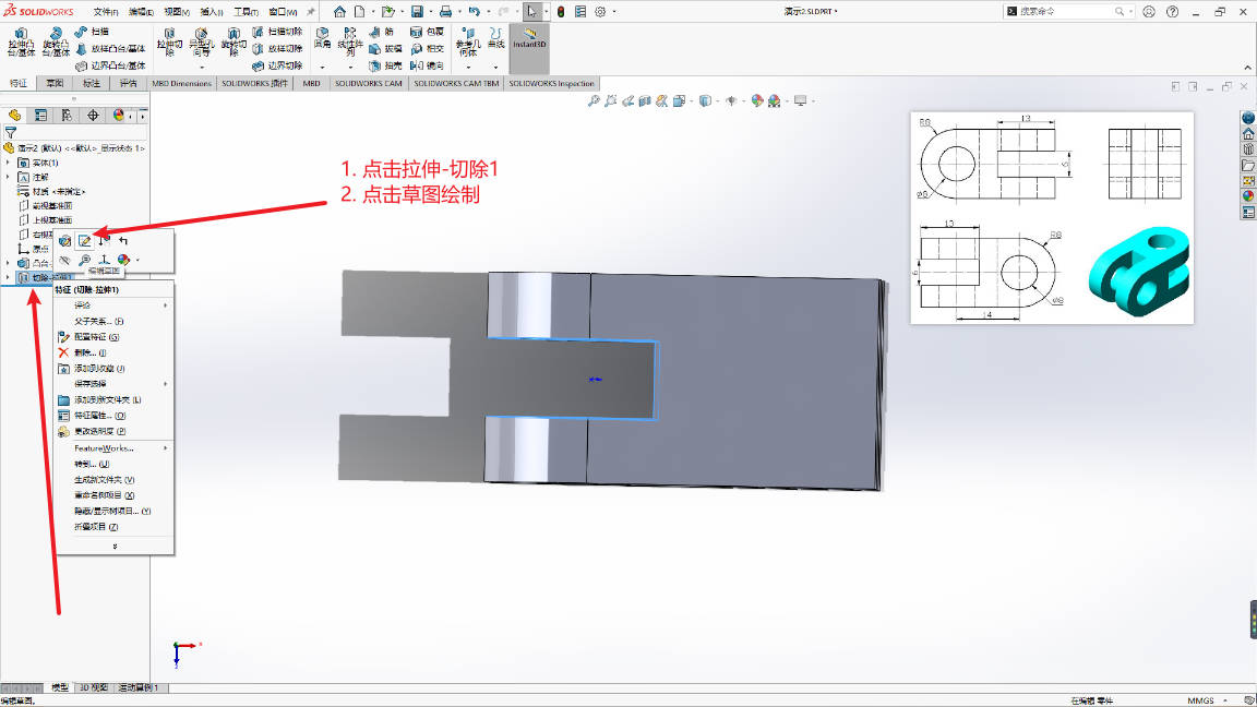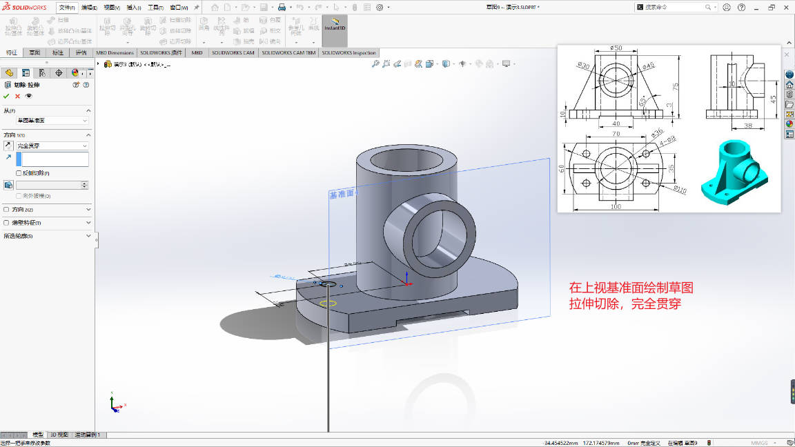 本文详细介绍了CAD软件的操作步骤,包括界面元素如菜单栏和文件管理,以及实例展示的草图绘制、尺寸标注、特征建模(如拉伸、切除等)、约束应用和几何修改(如剪裁和倒圆角),以及参考基准面的使用。