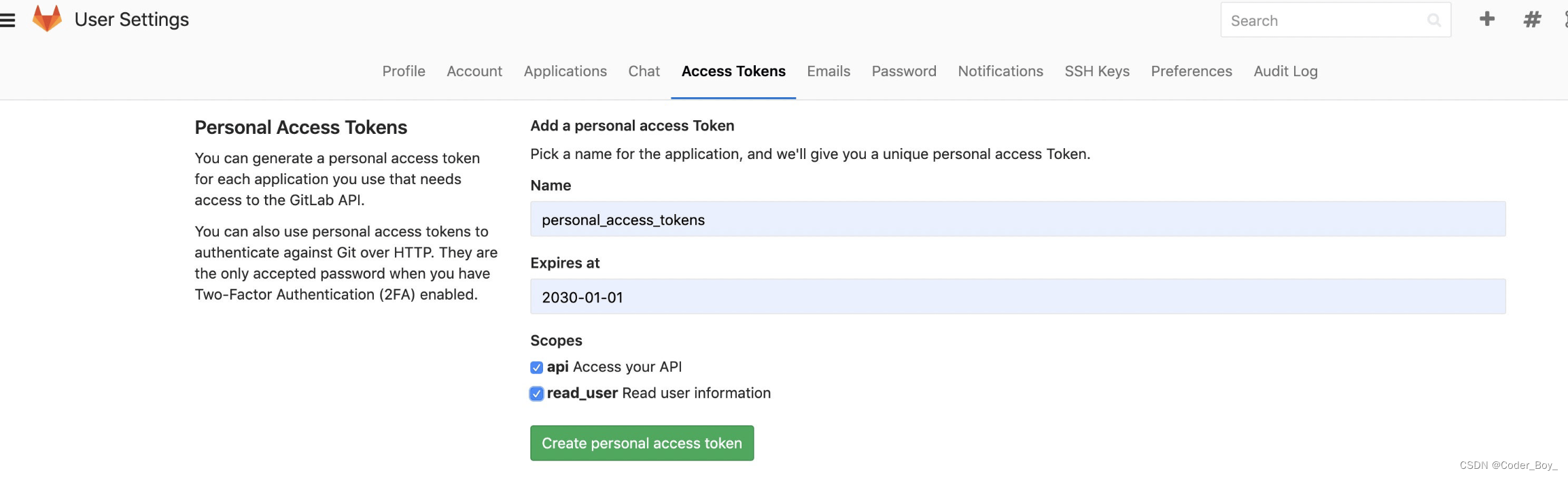 进入gitlab Settings页面, 点击Access Tokens标签