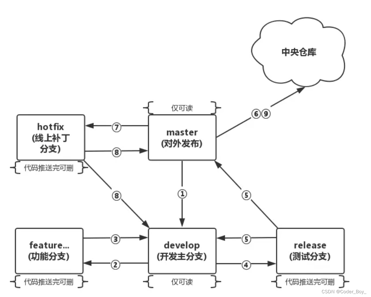 最后,修复后的hotfix分支要合并回develop分支和master分支(步骤⑧)。并推送到中央仓库(步骤⑨)。