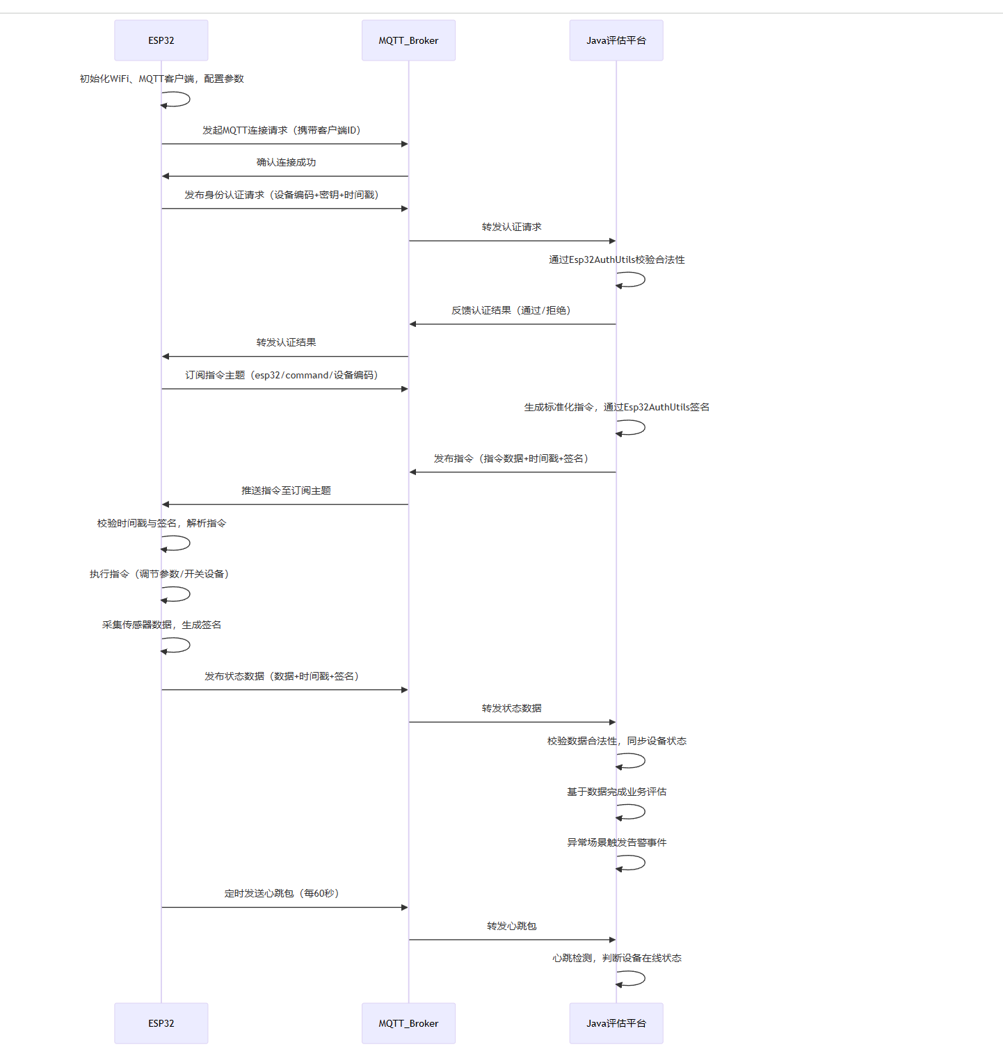 ESP32与Java业务平台的交互核心围绕“设备接入认证-指令下发执行-状态数据上报-平台评估反馈”四大环节展开,形成完整业务链路。
