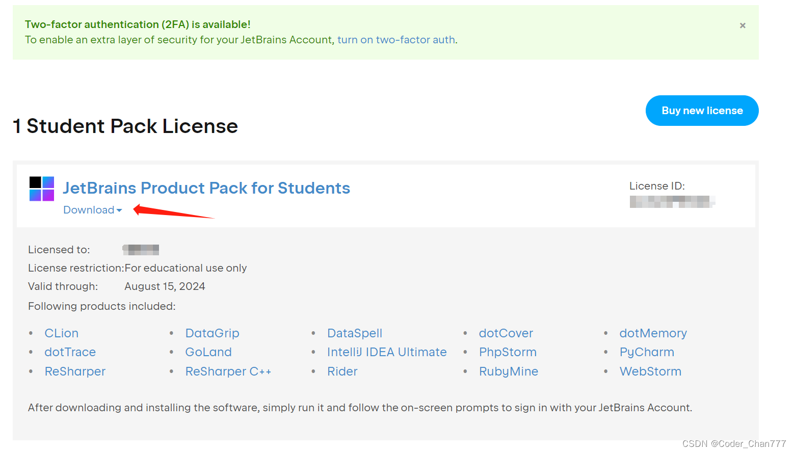 4、注册完以校园邮箱登录后会得到License ID,只需要在下载好的Idea、Pycharm等填上license或采用jetbrains账户登录即可