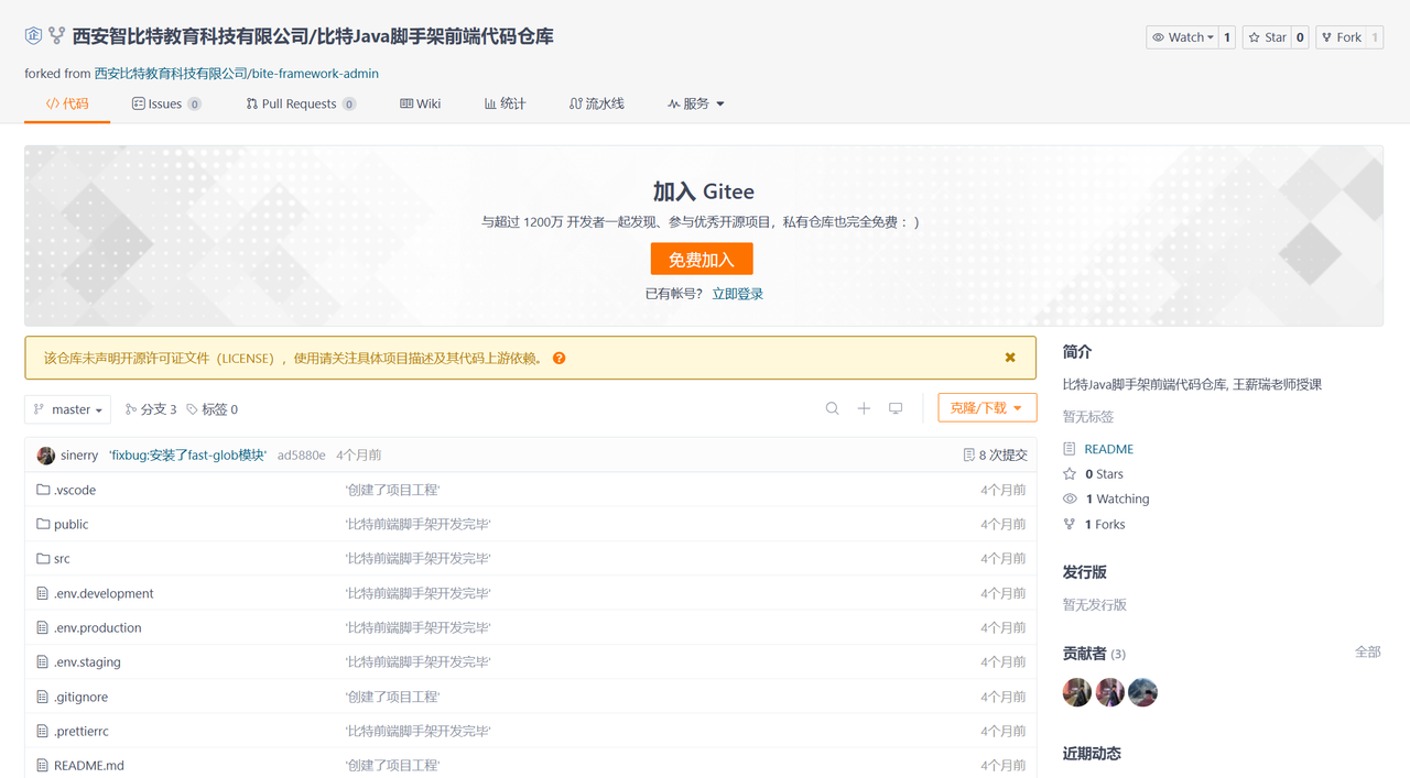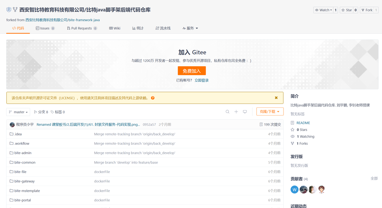 所以,除了若依之外,小宇想给所有大学生额外推荐一款更适合入门的选择 —— 比特 Java 脚手架。它相对轻量,核心逻辑更清晰,无论是理解原理还是实际上手,门槛都会低不少,更适合在校生逐步积累开发经验。项目源码地址:https://gitee.com/zhibite-edu/bite-framework-java(后端)、https://gitee.com/zhibite-edu/bite-framework-admin(前端)。码云截图如下: