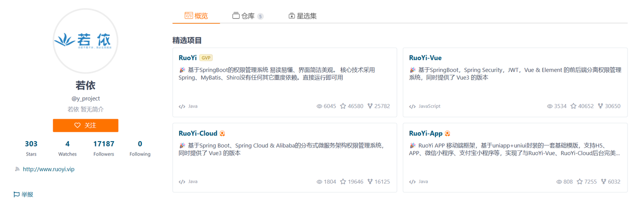 其实,市面上已有不少优秀的 Java 脚手架项目,其中一个非常知名的就是若依(Ruo-Yi)。它的项目源码地址是:https://gitee.com/y_project。大家可以看到,若依的作者提供了多个版本,能够应对不同的开发场景和技术需求。