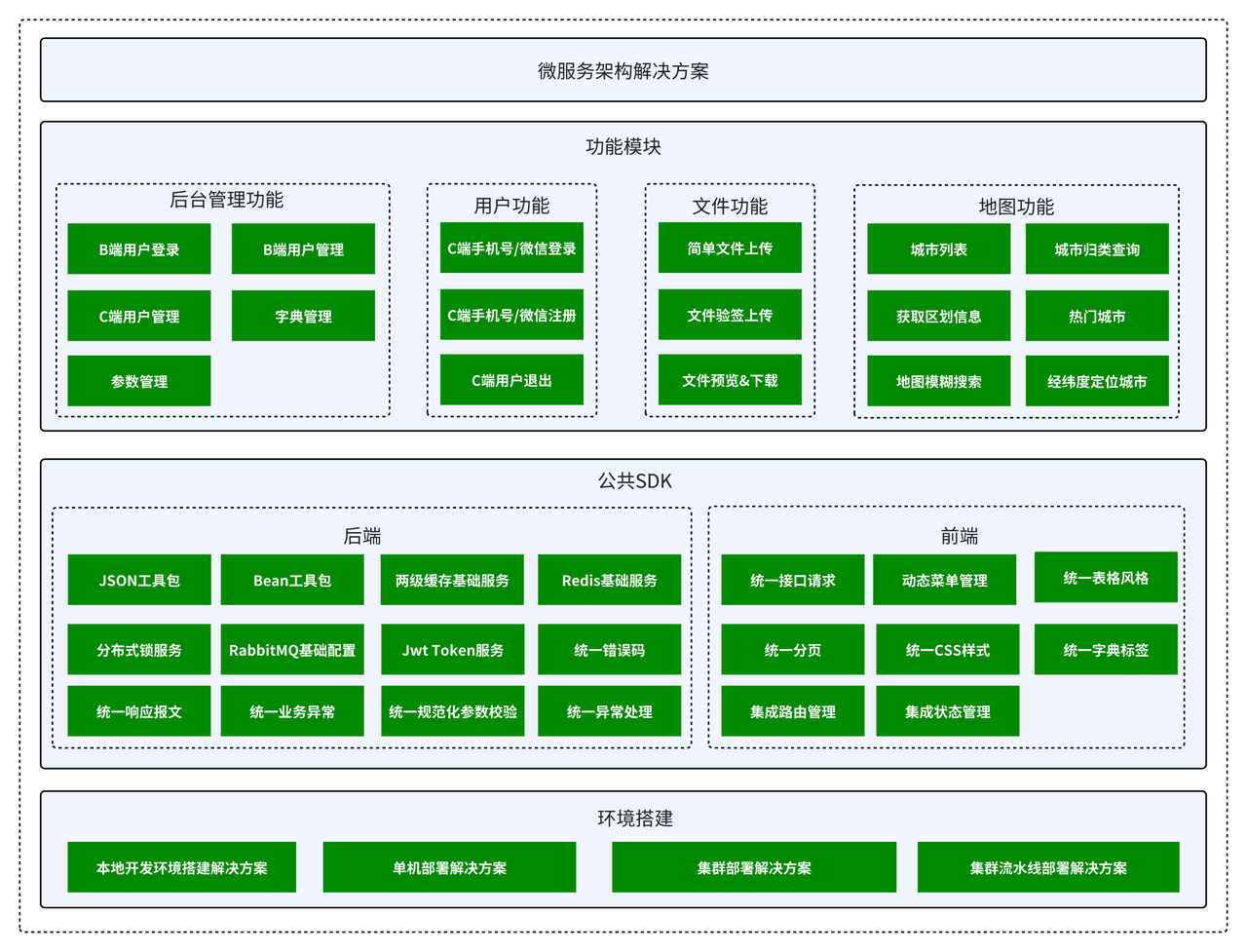 从下图中能清晰看出,《比特Java脚手架项目》功能十分强大。它不仅实现了前端与后端的全面覆盖,在功能模块上,涵盖了后台管理、用户、文件、地图等多类场景所需的丰富功能,公共SDK部分,后端有各类实用工具包与基础服务支持,前端也具备统一请求、动态菜单管理等便捷功能;环境搭建方面,从本地开发到单机、集群乃至流水线部署,都提供了完整的解决方案,全方位助力项目开发与部署,堪称“一站式”的高效开发利器。