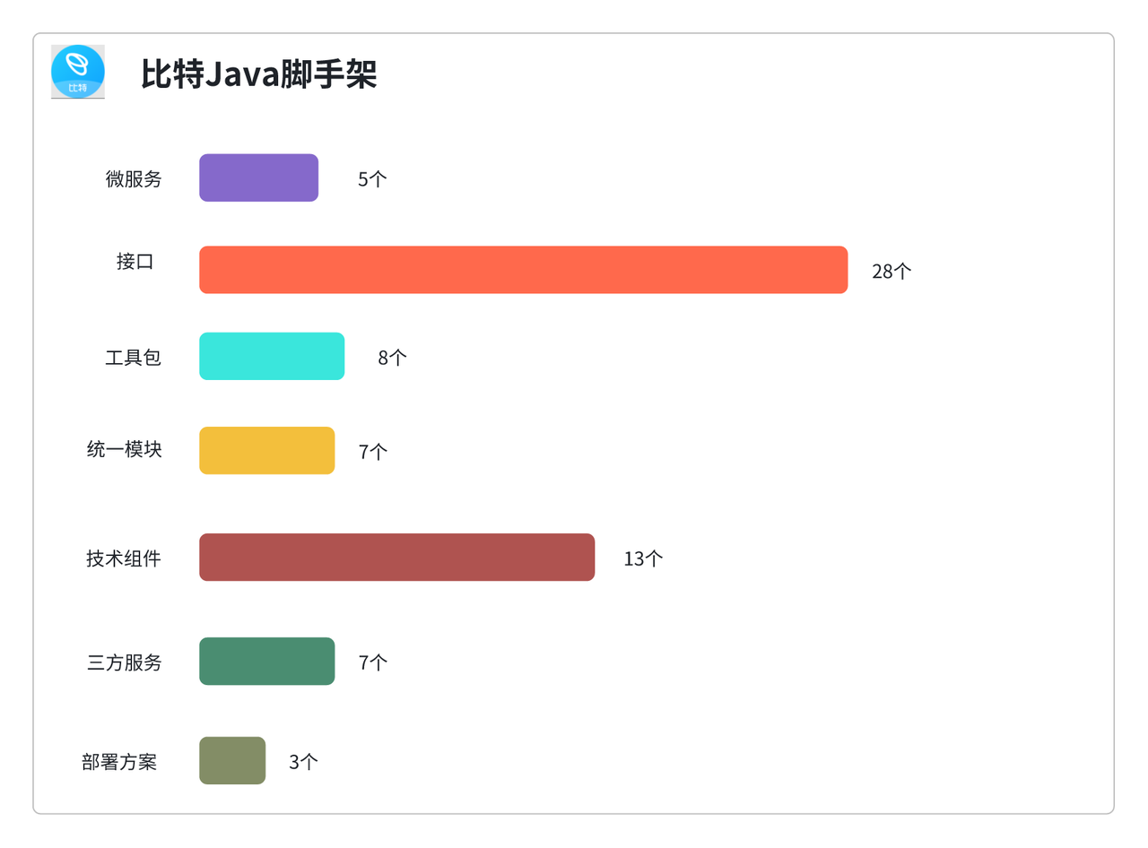 接下来,我们从项目各方面的数据维度,进一步了解这个项目。需要注意的是,本文仅针对"比特脚手架"的后端部分展开统计。下方展示比特Java脚手架后端相关数据和后端项目目录结构。