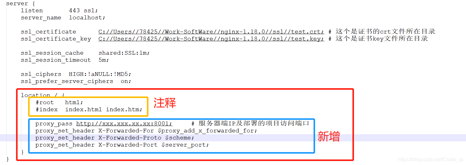增加: proxy_pass http://xxx.xxx.xxx.xxx:8001; # 服务器端IP及部署的项目访问端口