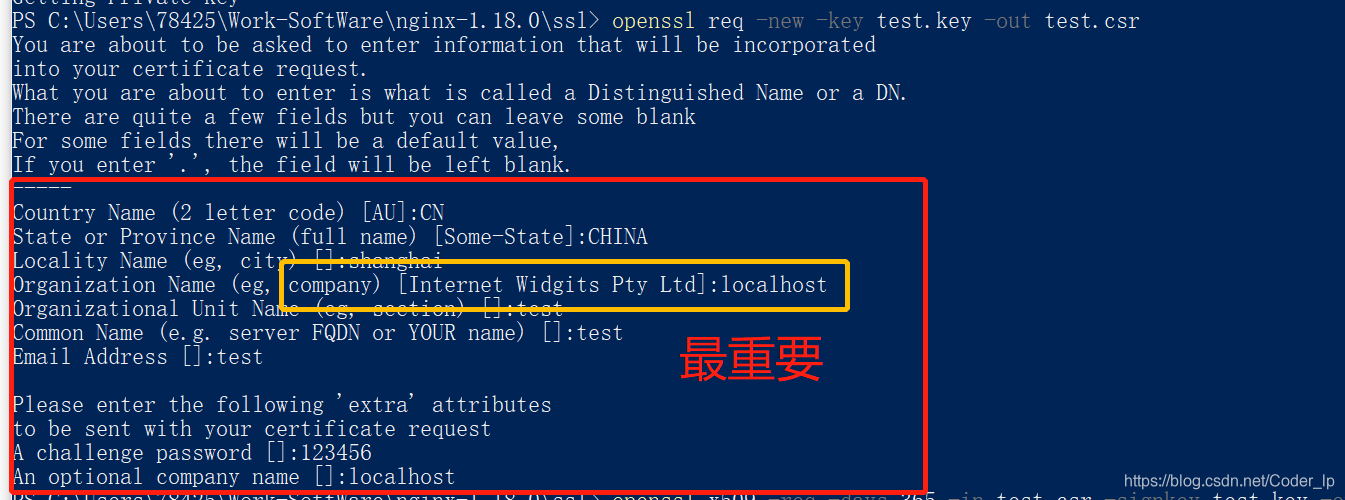 接着会让你输入一些数据,如下图,其他的都无所谓,随便输,黄色框起来的是要输入你的SSL证书绑定的域名/访问地址。这里我绑定的是本机。