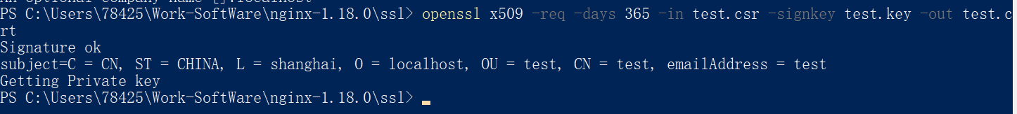 输入命令:openssl x509 -req -days 365 -in test.csr -signkey test.key -out test.crt