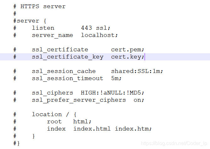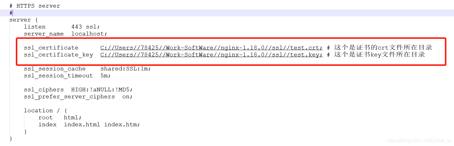 去除 #号,把 ssl_certificate 和 ssl_certificate_key 两个参数改为我们生成的证书相关文件,如下图: