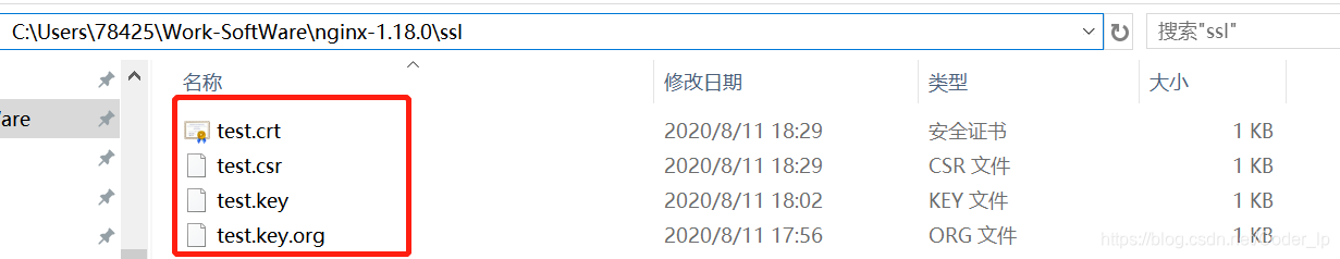 然后打开之前在nginx创建的ssl文件夹,会有四个文件: