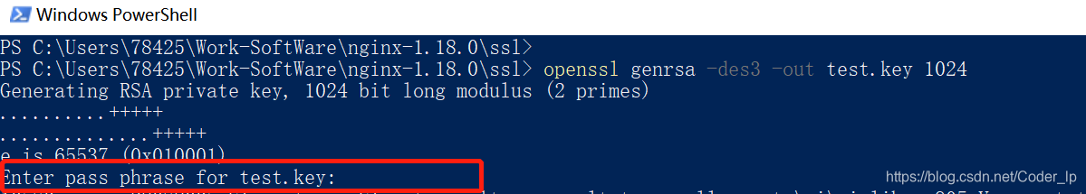 输入命令:openssl genrsa -des3 -out test.key 1024