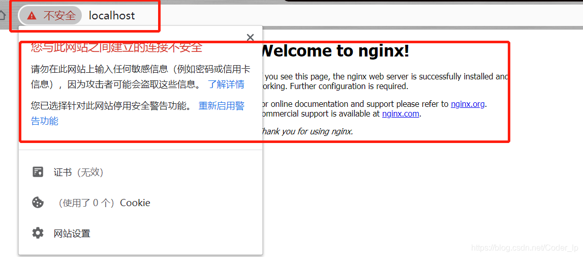 10)打开浏览器,输入 https://localhost ,你的浏览器可能会出现 “您的链接不是私密链接” 等提示信息,这时候点击高级,继续访问,出现下面的nginx欢迎页则表示成功!