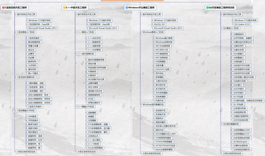 最后,无论你是在职场成长阶段还是在大学入门阶段,C/C++都是一个既可以强化思维能力,又可以打好编程基础的编程语言,你想要做软件开发,成为核心程序员的话,学习C/C++是比较好的选择,下面给大家分享一下C/C++的学习路线图: