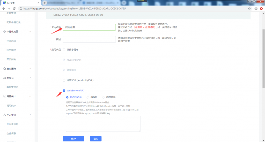 设置Key名称、【应用产品】设置为WebServiceAPI,其他保存默认设置,单击【保存】。