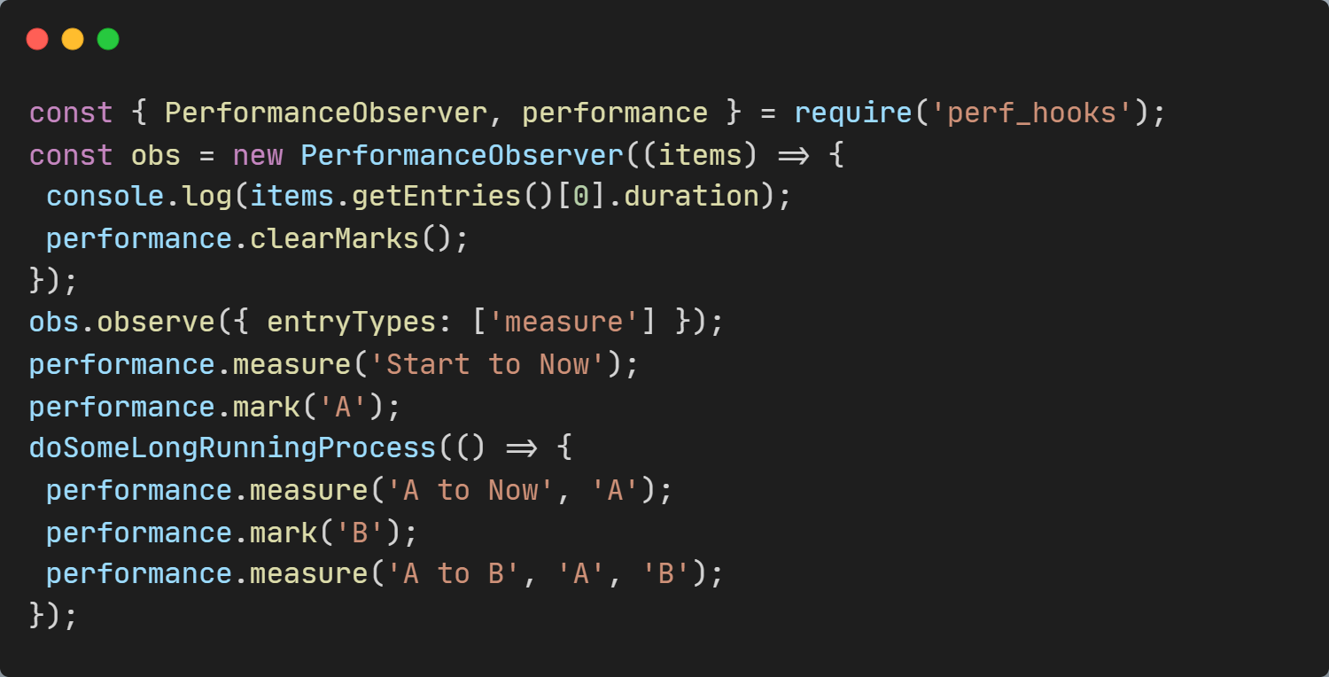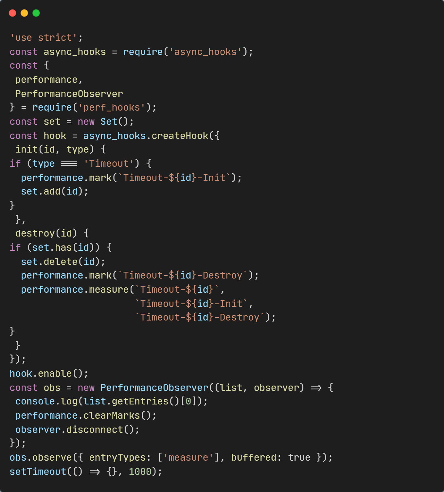 Performance API 为我们提供了找出必要性能指标的工具一个简单的例子是使用 async_hooks 和 perf_hooks