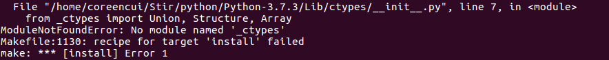 3.上述问题解决之后,运行make install 后仍未成功,显示:ModuleNotFoundError: No module named “_ctypes”