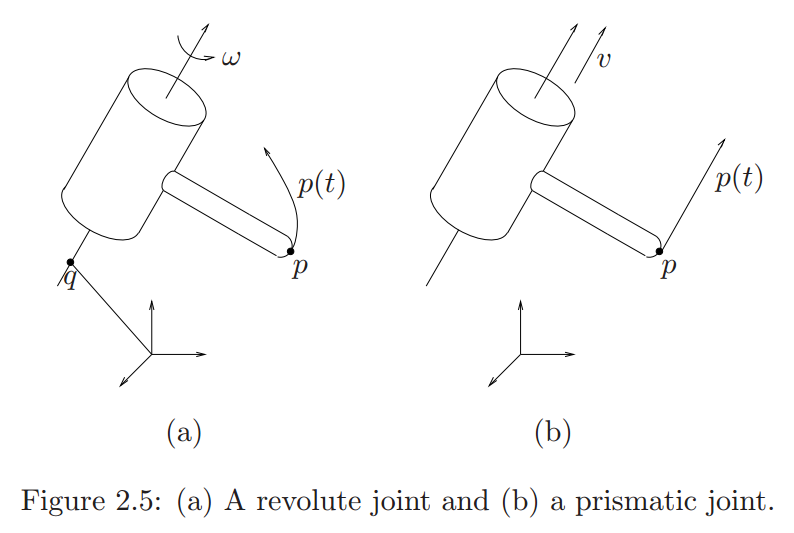 考虑图2.5(a)中的单连杆机构在参考坐标系中运动, q q q为旋转轴上的一点, p p p为连杆上的一点,绕单位角速度 ω \pmb\omega ωωω( ω ∈ R 3 \pmb\omega\in \mathbb{R}^3 ωωω∈R3,且 ∥ ω ∥ = 1 \left \| \pmb\omega \right \|=1 ∥ωωω∥=1)做旋转运动。我们知道,角速度方向的确定方法是:遵循右手法则,四指指向运动方向,大拇指指向即角速度方向。因此,在图2.5(a)中,令 p ( t ) \pmb p(t) ppp(t)表示 p p p 点 t t t 时刻在参考坐标系中的坐标, q \pmb q qqq表示 q q q点在参考坐标系中的坐标,则 p q → = p ( t ) − q \overrightarrow{pq}=\pmb p(t) - \pmb q pq=ppp(t)−qqq。因此,根据向量积的物理意义,有 p p p点的线速度为: