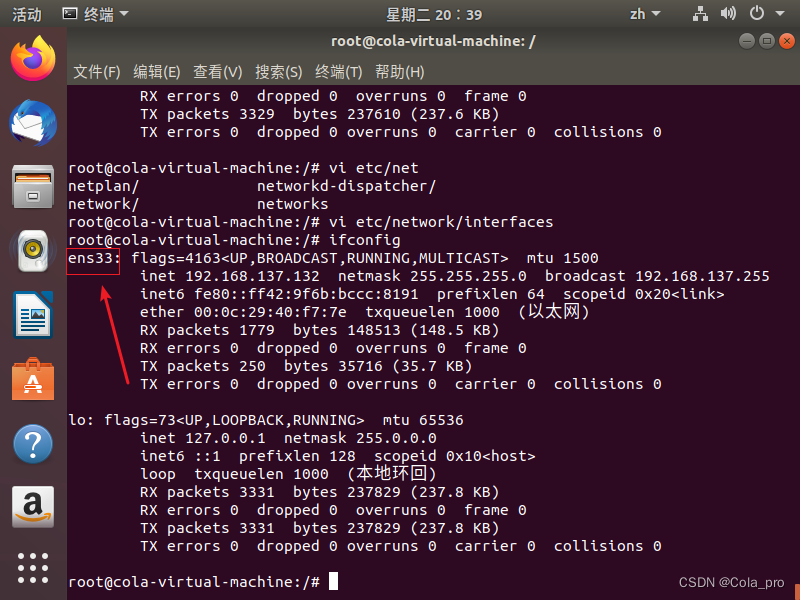 在ubuntu终端,执行ifconfig,查看自己网卡名