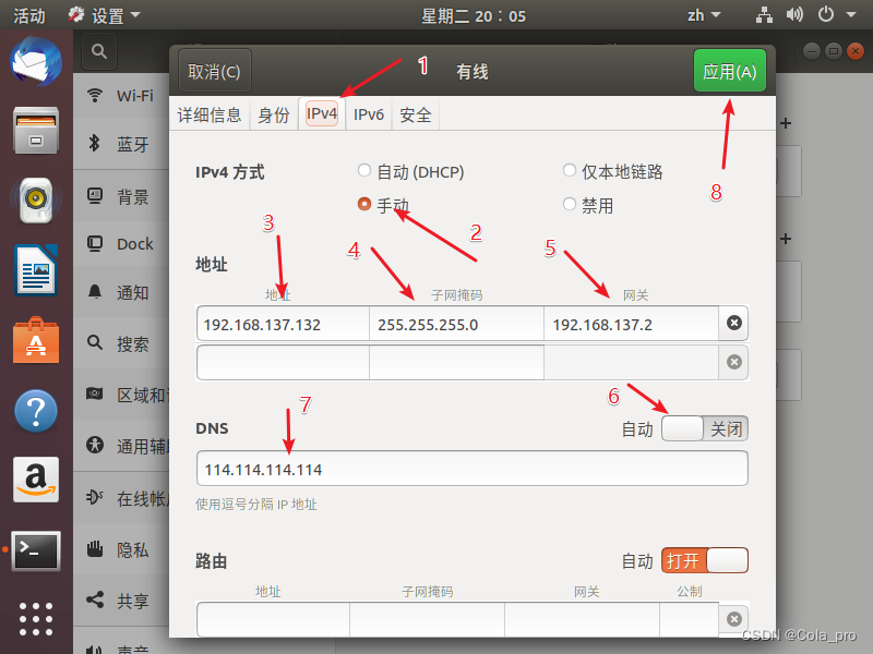 按图中步骤打开ubuntu网络设置,并且IP、子网掩码和网关,将IP地址设置在子网范围内,并且记住,等下在配置文件中还需要。