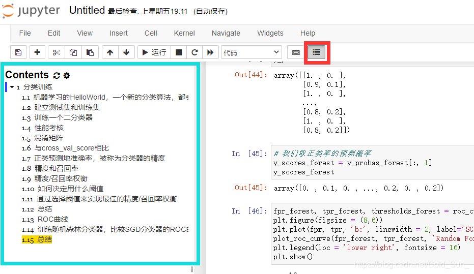 3、在新大开的 ipynb 文件中点击下图红框中菜单, 就有如下的目录
