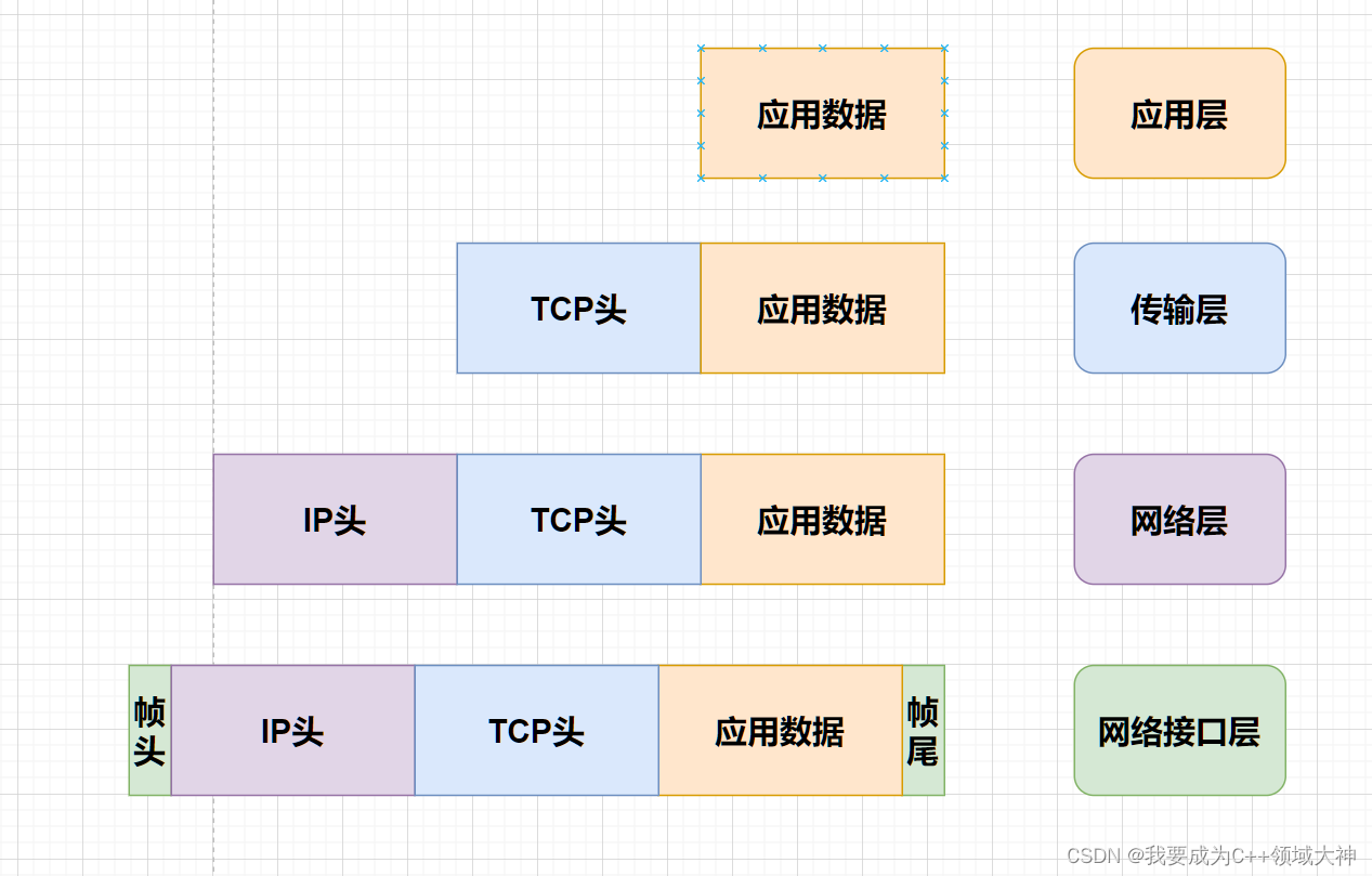 数据从传输层到物理层,在原数据包的基础上增加了帧头,变成了帧(frame)。帧头包含了目的MAC和源MAC。
