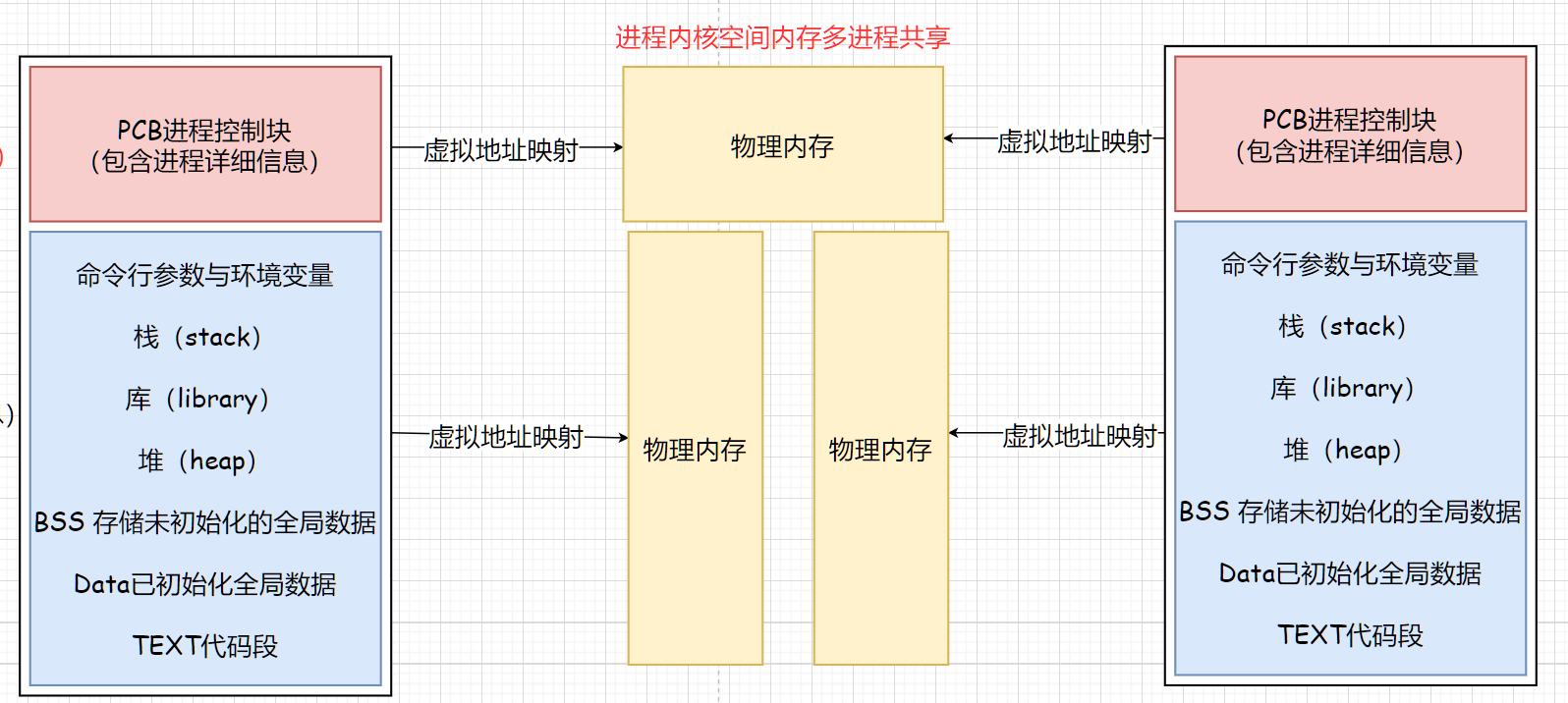 进程内核空间内存允许多进程共享,因为内核空间开发者无权限访问。同时将所有进程的内核层都映射到这一块物理内存,方便PCB进程控制块记录物理内存。