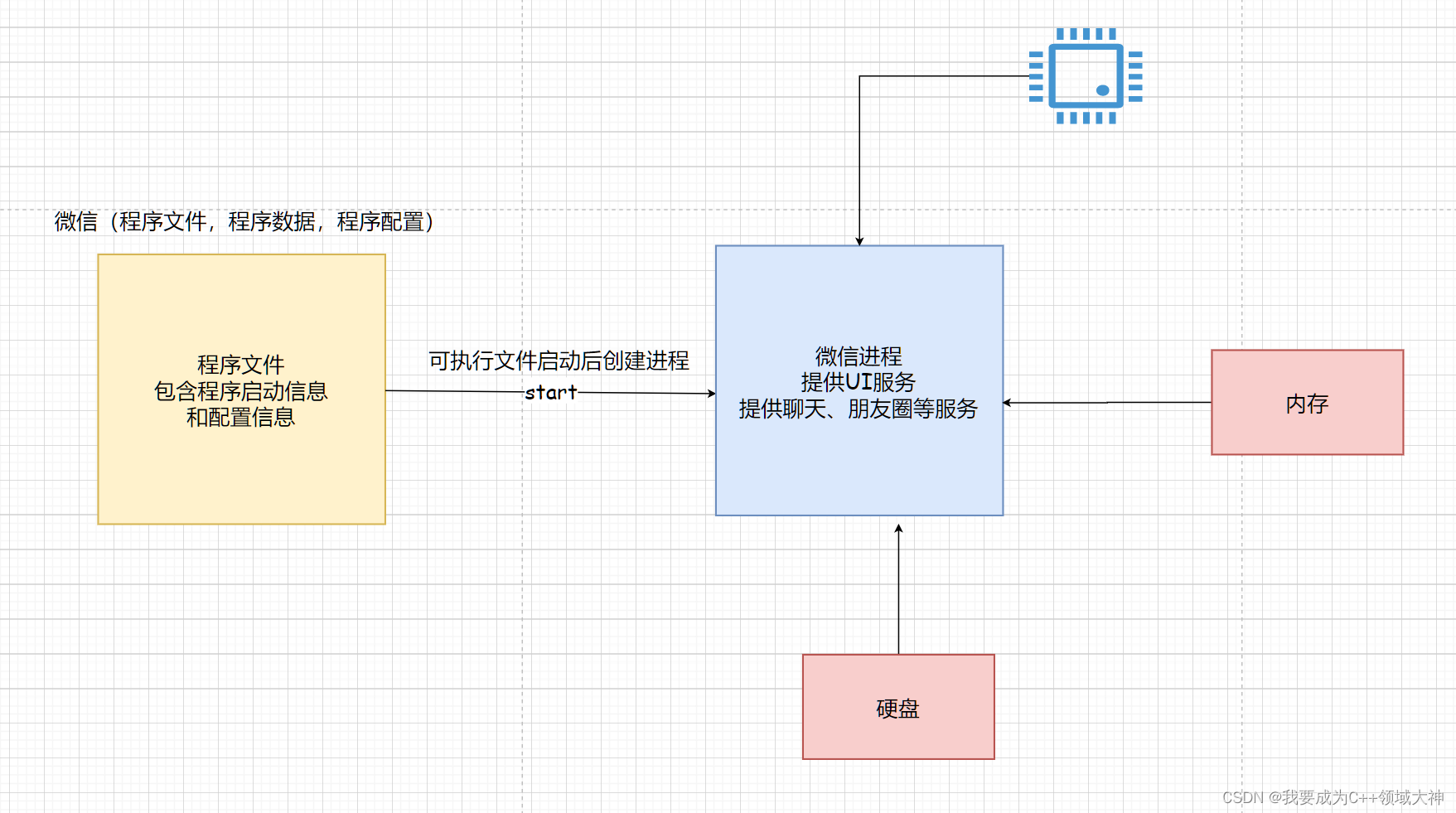 我们编写的程序是存储在电脑磁盘中的静态数据,是进程的静态表现,例如微信,包含程序文件、程序数据、程序配置。当我们执行可执行文件exe后(启动),会创建进程,装载到内存中去,CPU会执行程序中的指令,这个运行中的程序,就被称为「进程」(Process)。