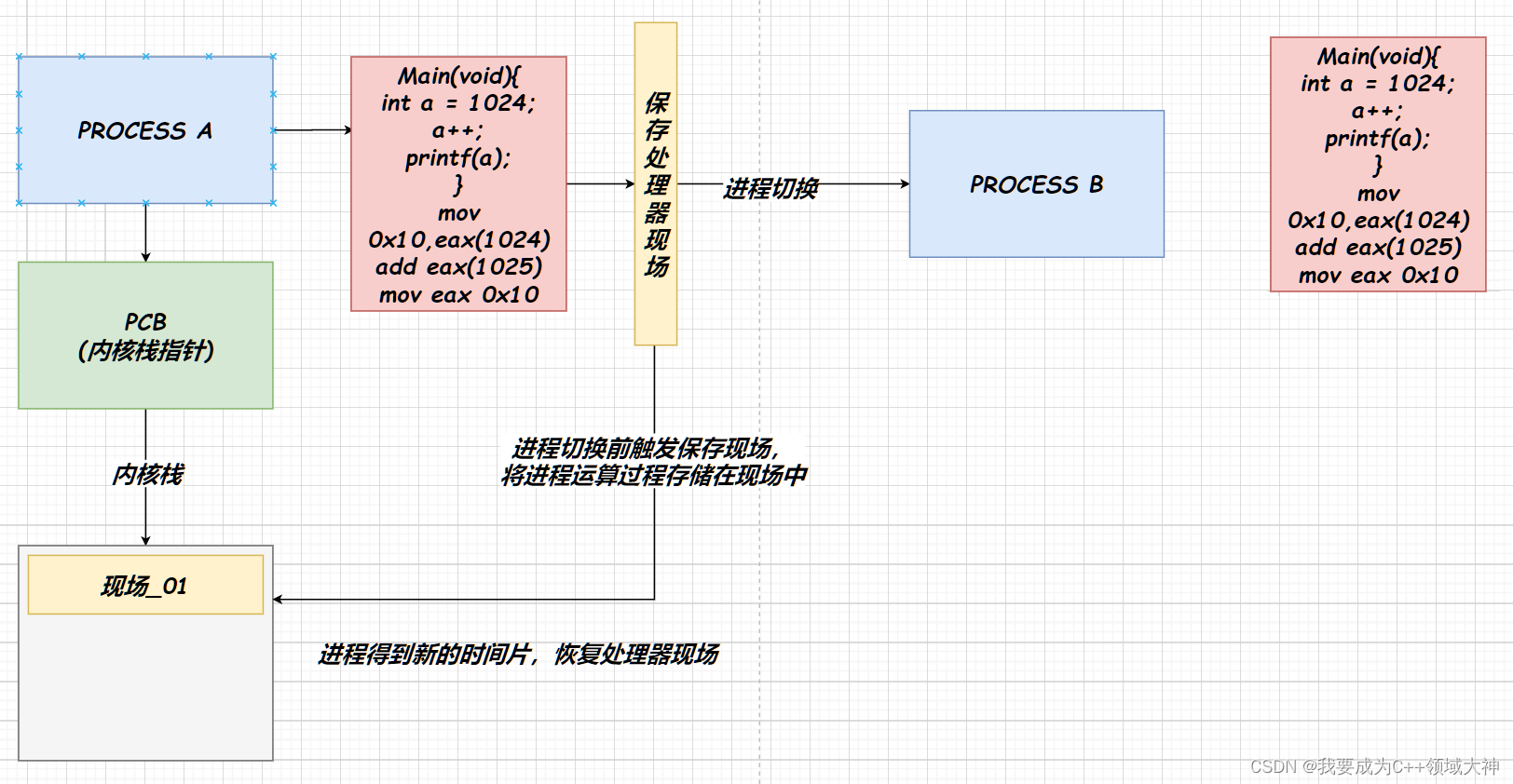 如下图所示,当进程A和进程B同时执行一段代码进行变量a自增的操作,那么他们都需要用到eax寄存器,但是处理器寄存器数量有限,我们就需要将此刻进程A的处理器现场保存到内核栈中去,当进程A需要恢复现场时,再通过进程A的PCB中的内核栈指针,找到保存在内核栈中的现场恢复。所以我们可以说进程、线程就是寄存器和栈