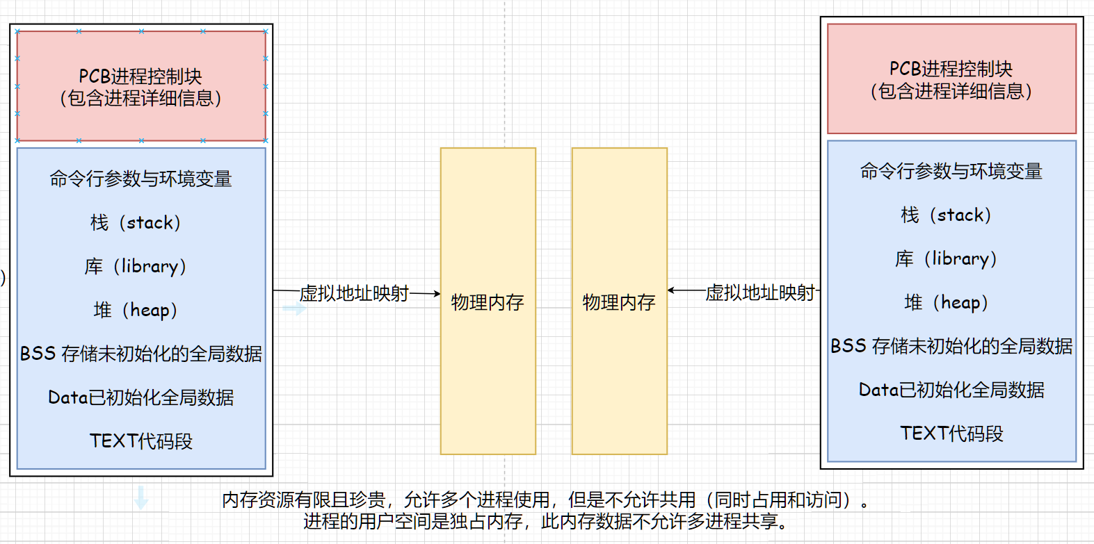 进程的用户空间是独占内存,此内存数据不允许多进程共享。
