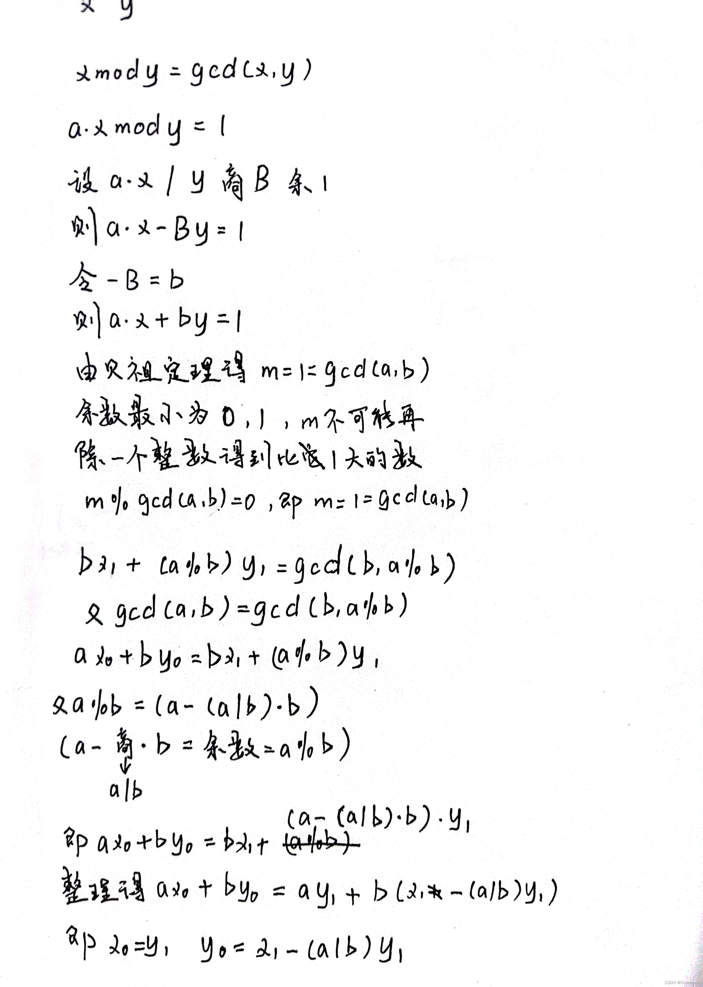 2.设第一个等式为ax0+by0=gcd(x0,y0),第二个等式为bx1+(a%b)y1=gcd(b,a%b),则x0=y1,y0=x1-(a/b)y1,详细推导见下图。