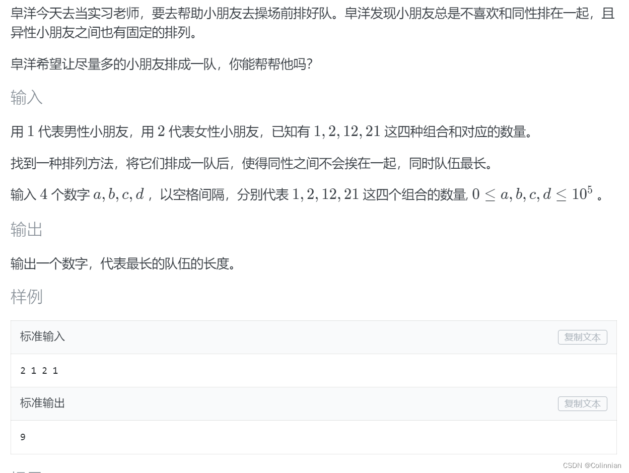 4.如果a和b不相等呢,假如1有6张,2只有4张,这样组合成{2,1}后前面最多容纳一张1,{2,1},所以,这样的情况2,【12】,1,【21】,{2,1}如果2多出来n(n>1)张,我们只能排一张在末尾,2,【12】,1,【21】,{2,1},2,剩下的都无法在排,所以从中我们可以得出,在a!=b的情况下,长度为2*(c+b)+std::min(a,b)+1;