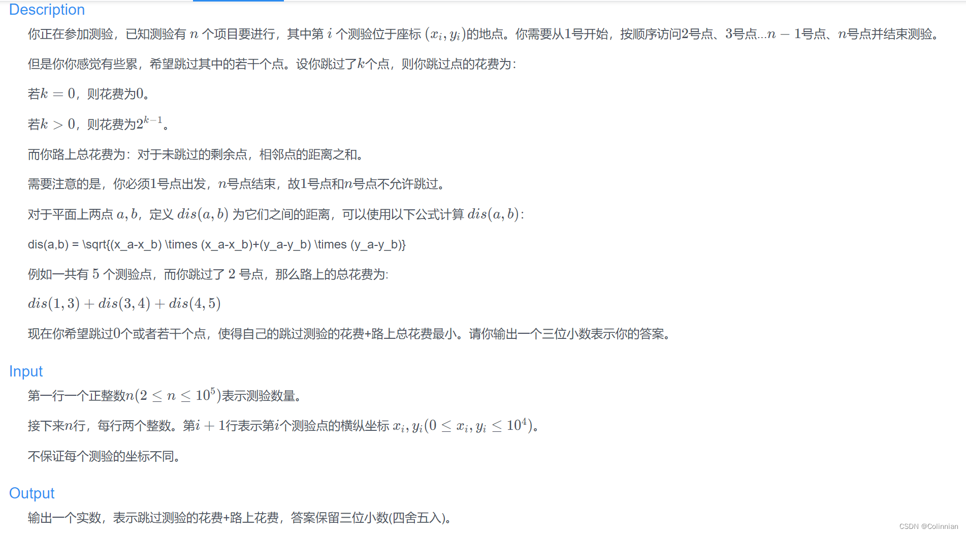 设dp[i][j]表示前i个点跳跃j次,那么上一个跳跃点为i-k-1,由于消耗了j个跳跃点当中的4个跳跃点,所以状态转移方程为dp[i][j]=min(dp[i-k-1][j-k]+dis(i,i-k-1)-power(2,j-k-1)+power(2,j-1))为什么要减掉power(2,j-k-1)呢,因为在计算dp[i-k-1][j-k]的时候我们加上过power(2,j-k-1)
