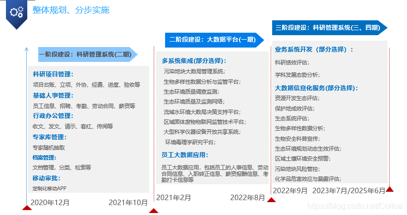 10oa专家团体通过整体规划,分步实施,一阶段完成了使用密集程度比较高的流程替换,在提升流程管理和使用效果的同时,让员工逐步习惯系统转变。二阶段对已上线的功能进行深化应用,并多系统集成,利用大数据技术进行处理,并开发员工大数据应用。三阶段基于前期的实施经验和平台,利用BPM技术增强开发两个业务系统,并与现有其他的多个系统数据对接、增强开发两个大数据应用。