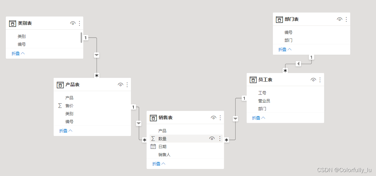 前面我们讲解的数据模型是比较简单。本课我们加大难度。如下图所示,分别准备了“类别表”、“产品表”、“部门表”、“员工表”、“销售表”。从整个数据模型在看,“销售表”是事实表,除此之外全是维度表。现在已经建立好关系。
