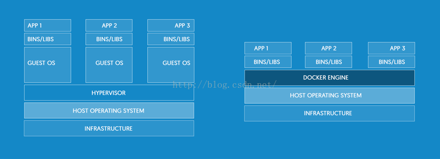 传统虚拟化和容器技术结构比较:传统虚拟化技术是在硬件层面实现虚拟化,增加了系统调用链路的环节,有性能损耗;容器虚拟化技术以共享Kernel的方式实现,几乎没有性能损耗。