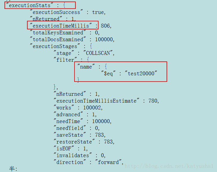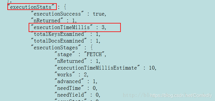 executionStats下的executionTimeMills表示整体查询时间,单位毫秒。