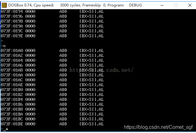 例如输入u可以查看系统的汇编指令,一直输入u会列出系统所有的汇编指令。如下图所示: