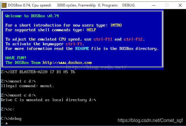 将debug.exe拷贝到D盘(某盘根目录),在DOSBOX中输入“mount c D:\”命令(此命令输入后有“Drive C is mounted as local directory d:\”,再输入“c:”回车。然后输入debug,结果如下: