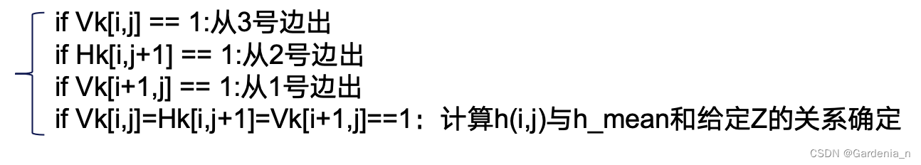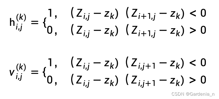 判断相交的准则如下公式所示,其中k表示等高线高程序号,Zk表示待求等高线高程。其中i、j表示格网行列号,Zij表示DEM格网中对应序号点的高程,hij表示对应格网边的状态。