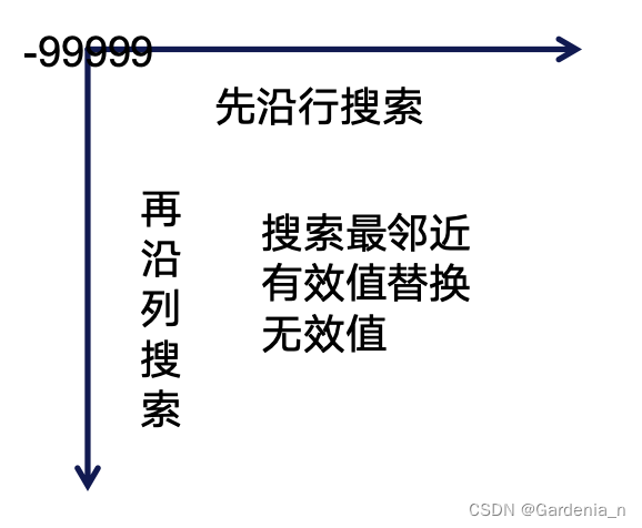所以我们要对这些无效值进行处理,处理方法是:最邻近元法。首先找到无效值的位置,然后先沿行,再沿列逐个搜索,找到的第一个有效值数据赋值给该无效值,完成无效值处理。