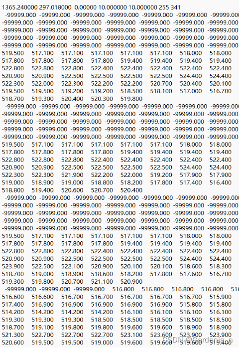 通过记事本打开DEM数据,观察数据我们可以发现,其中存储的高程数据有大量的值为“-99999”的无效值,这将影响后续DEM状态矩阵计算。