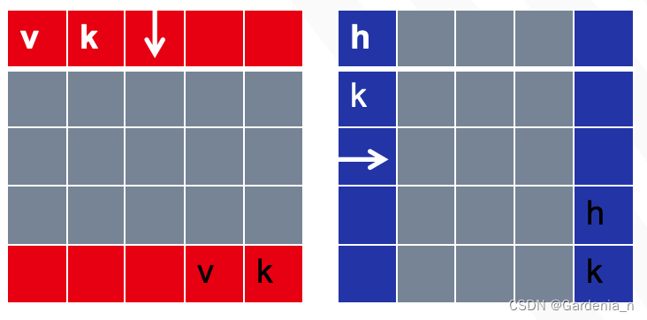 表示了DEM与等高线水平边(Hk)和竖直边(Vk)的相交状态。若Hk(i,j)=1,说明ij对应的格网与DEM的水平边有交点,既有等高线通过。示例如下图所示: