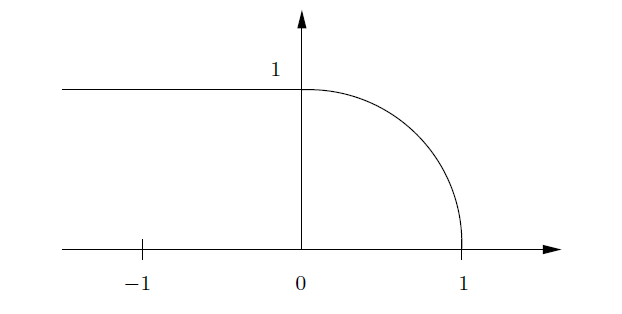 中的不连续性更难以可视化; 就图表而言,它通常是曲率的不连续性。 例如,想象一条曲线,由一段圆弧和一条在其端点与圆弧相切的线段组成。类似下面的图。