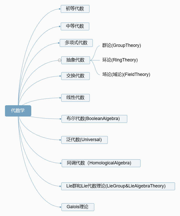代数通常理解为算术的推广。算术研究特定数场(domain)(例如实数场)内的加法、减法、乘法和除法等运算。初等代数(elementary algebra)构成了抽象的第一层级。与算术类似,它也局限于特定类型的数和运算。它通过允许以变量形式表示的不定量(除了数之外)来推广这些运算。抽象代数(abstract algebra)是更高层次的抽象,它不局限于特定场,而是研究群和环等代数结构。它超越了典型的算术运算,还涵盖了其他类型的运算。泛代数(universal algebra)则更为抽象,因为它不关注特定的代数结构,而是研究代数结构的一般特征。